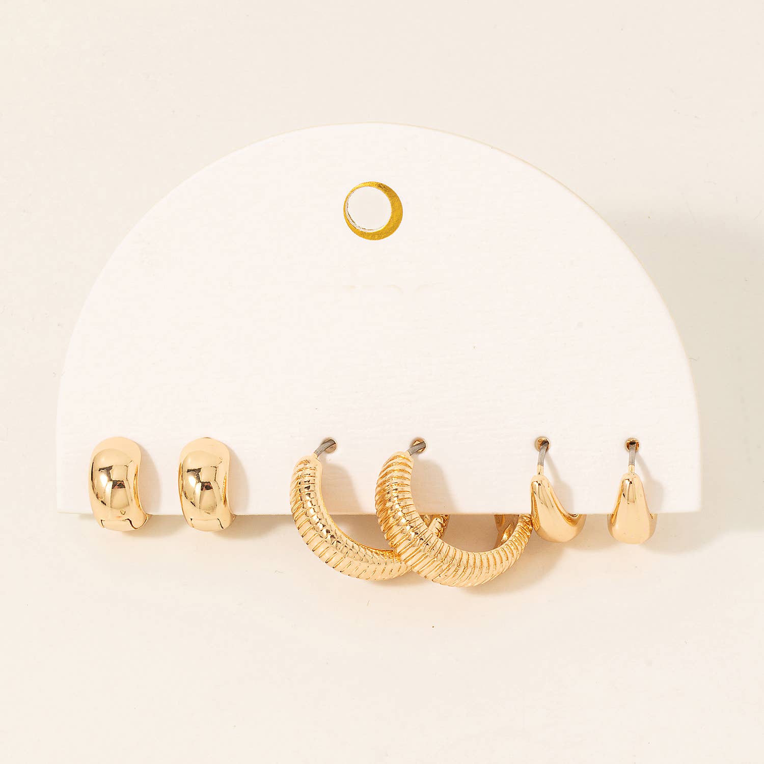 This pair of hoop earrings brings a unique assorted 3pc metallic set style. Immerse yourself in the world of understated glamour as this accessory effortlessly exudes timeless appeal.